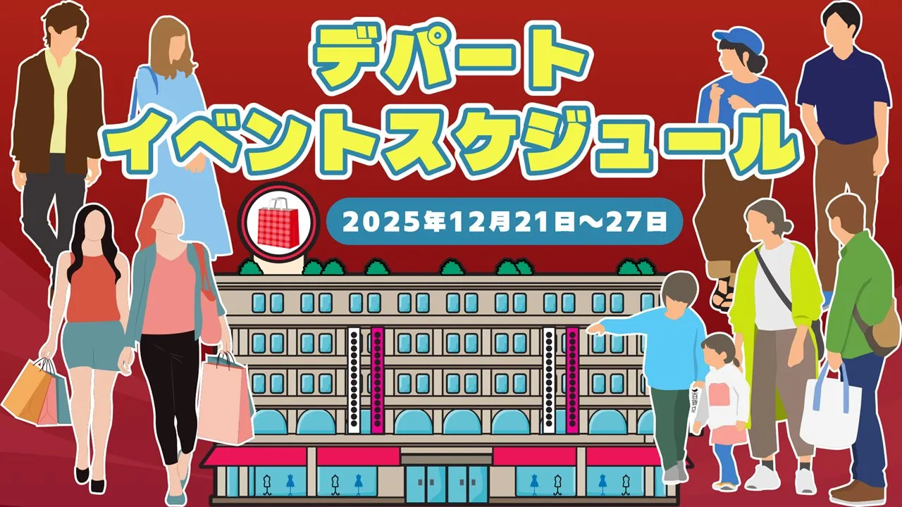 2025年12月21日週に日本橋三越、日本橋高島屋、銀座三越、松屋銀座、新宿高島屋、伊勢丹新宿、京王百貨店新宿、小田急百貨店新宿、大丸東京、東武百貨店池袋、西武池袋、松坂屋上野の催事場で行われるイベントは次の通りです。おでかけ予定に役立ててください!
