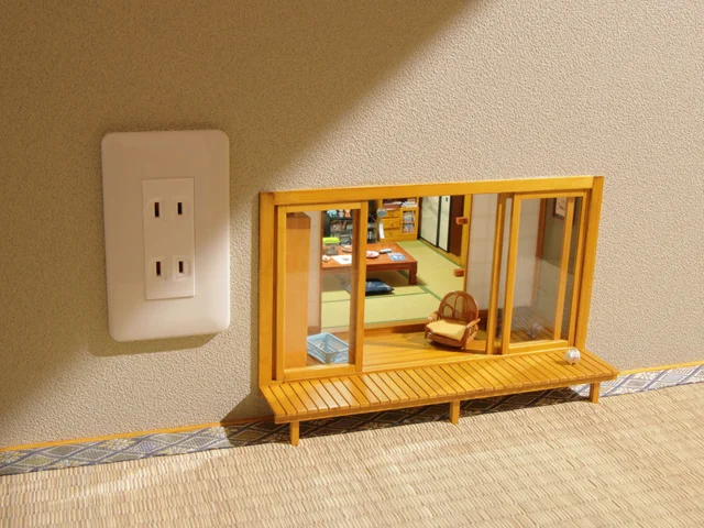 こびとが過ごす、おばあちゃん家の夏休みをイメージした「こびとの縁側」には、首振り扇風機や柱にかかった温度計など、昭和レトロな民家が見事に再現されています。
