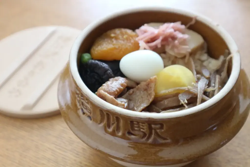 長野新幹線開通以前、信越本線の横川~軽井沢間は急こう配のため、補助動力となる機関車連結・分離に両駅で10分ほど停車しました。その時間を利用して多くの人が買い求めた駅弁が、横川駅前にある荻野屋の峠の釜めしです。